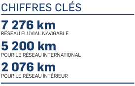 Le fleuve Congo constitue un des éléments essentiels du réseau de transport fluvial du pays et forme avec l’Oubangui l’axe transéquatorial du réseau fluvial international. Ces fleuves sont navigables jusqu’à la frontière avec la RCA. Le fleuve Congo est le 2ème du monde après l’Amazone par son débit. Le réseau fluvial navigable est de 7 276 km dont 5 200 km pour le réseau international et 2 076 km pour le réseau intérieur.